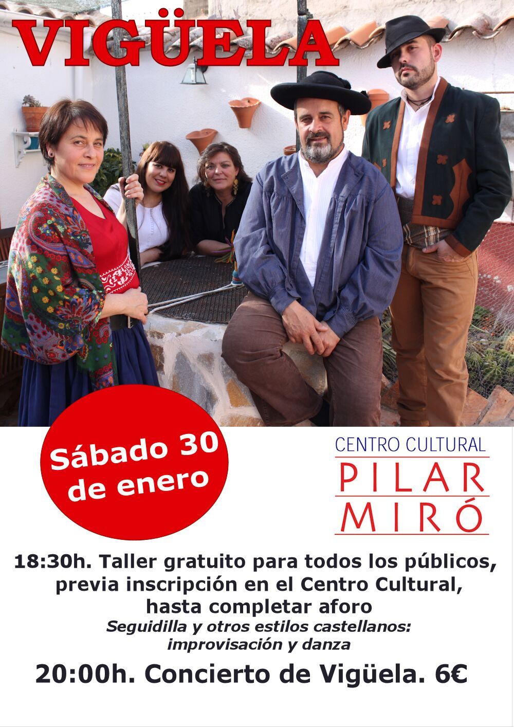 Vigüela, grupo de El Carpio de Tajo (Toledo), lleva trabajando más de 30 años en la recopilación, interpretación y difusión de las músicas de raíz castellanas. En 2014 llegan a punto de inflexión en el camino hacia la música tradicional más genuina y este resultado ha cristalizado en Temperamento, disco que será editado y distribuido internacionalmente por el sello británico ARC Music en 2016. Vigüela son Pablo Garro, Elena Pérez, Carmen Torres, María Nieto y Juan Antonio Torres. Los instrumentos que utilizan son guitarra, laúd, rabel, percusiones diversas (piedras, varas, botellas, herramientas de labraza) y sus voces.